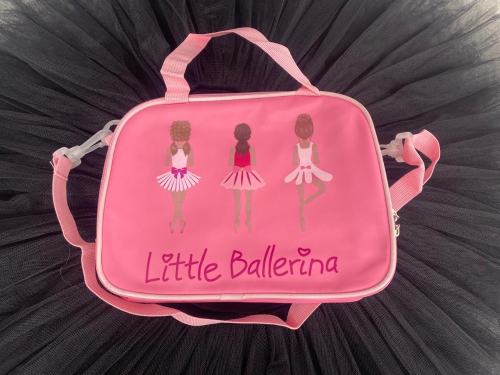 Maletita rectangular con asas y correa Color: Rosa Con estampado de bailarinas Medidas: Largo: 25 cms Alto: 20 cms Ancho: 10 cms