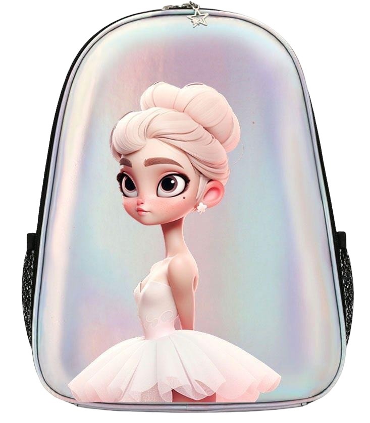 Mochila tipo back pack Color: Plateado tornasol Con estampado de bailarina con tutu blanco Medidas: Alto: 34 cms Ancho: 11 cms Largo: 26.5 cms
