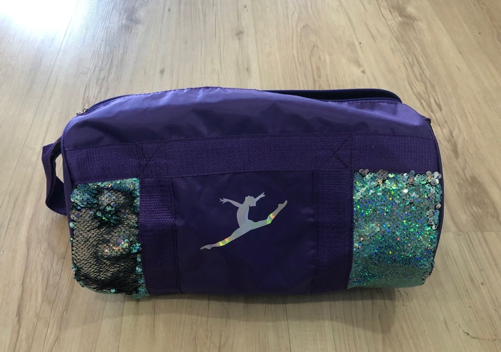 Mochila cinlindrica morada con franjas de lentejuelas reversibles de plata a verde Con correa fija Medidas:18 cms de diámetro x 38 cms Modelo: ATT42