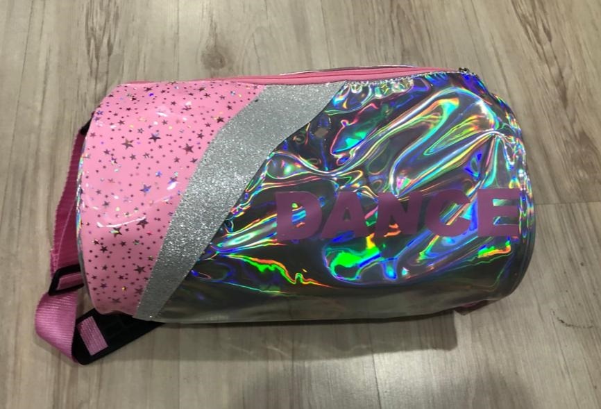 Mochila cilindrica plata con rosa y una franja de aplicación de glitter