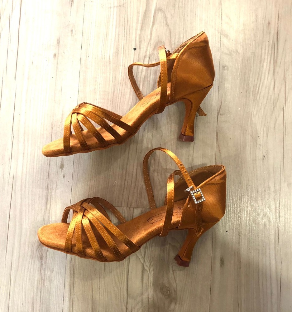 Zapato para ritmos latinos de tela satinada y suela de gamuza Zapato flexible Alto del tacón: 7.5 cm Color: Cobre